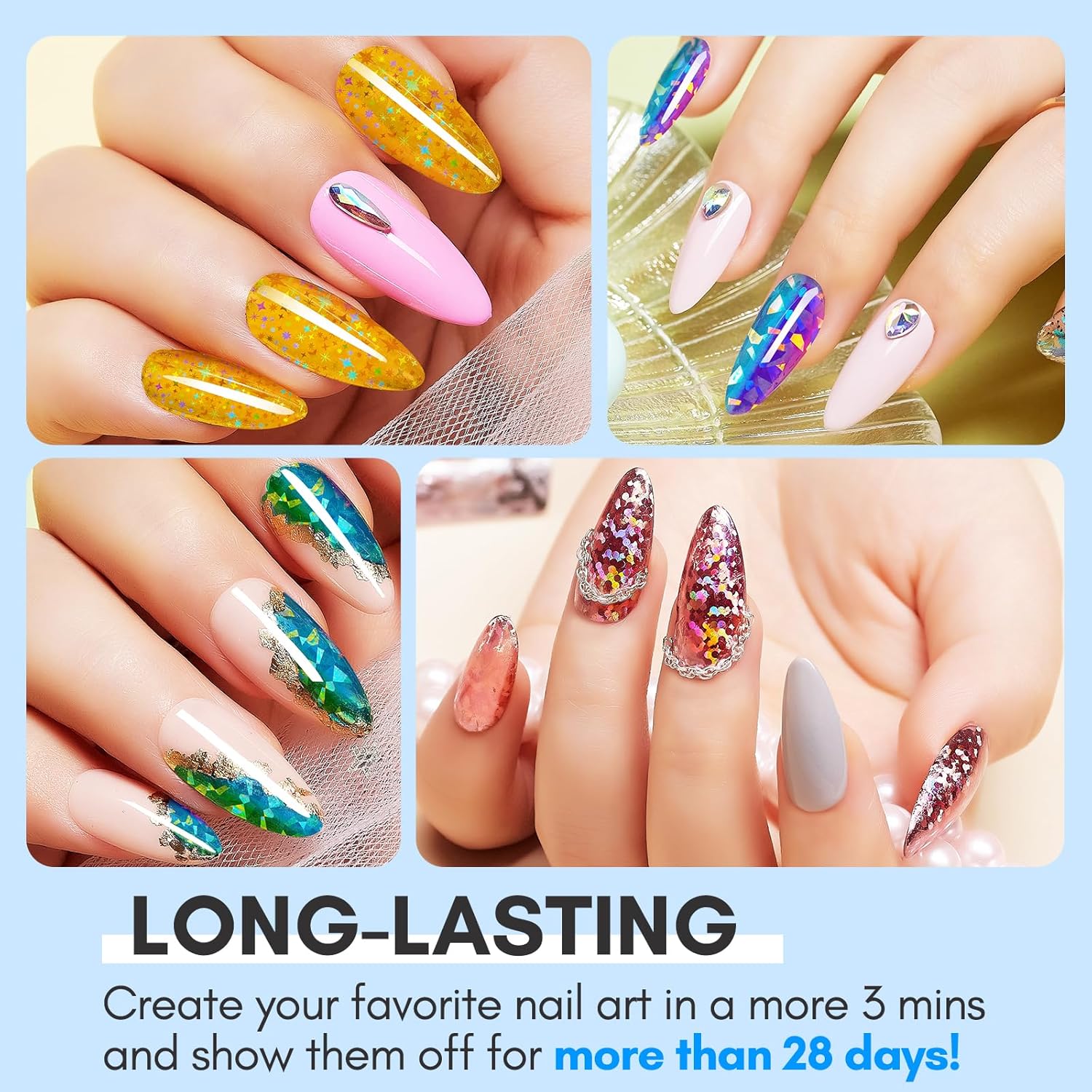 - High-Quality Material Foil Glue: Our foil gel a is natrual resin, slight odor, long lasting, strong adhesion, non-toxic , harmless to skin and nail. Avoid contact with eyes, mouth, and skin. Note: Stop using the product if redness and itching develop.