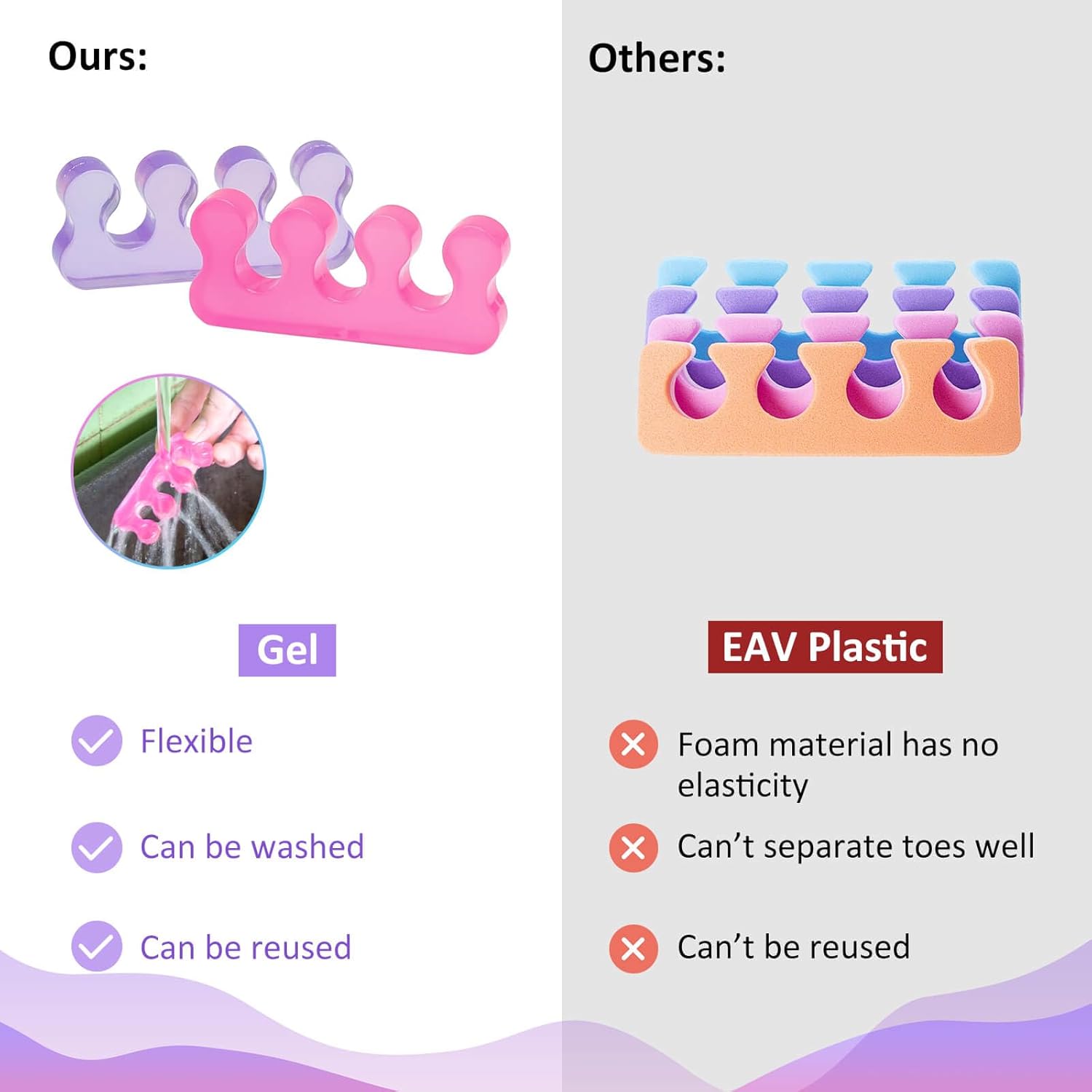 - đăReusable, easy to cleană Toe Separators for Pedicurecan be cleaned repeatedly, and jelly material that can be used multiple timesis not easy to deform. Upgraded version of Foam pedicure toe separator. Rinse once with water before use.ăServiceă:We love our customers,If you are troubled by product problems,please contact us as soon as possible to solve it for you,including return or exchange.