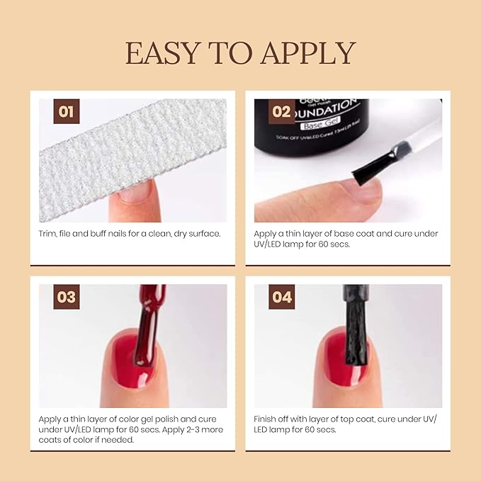 - Speed Curing with UV/LED Nail Lamp: The natural skin tone series gel polish set needs to be cured under LED/UV light. Base and Top coat required. Average for UV/LED light 60-120 secs.