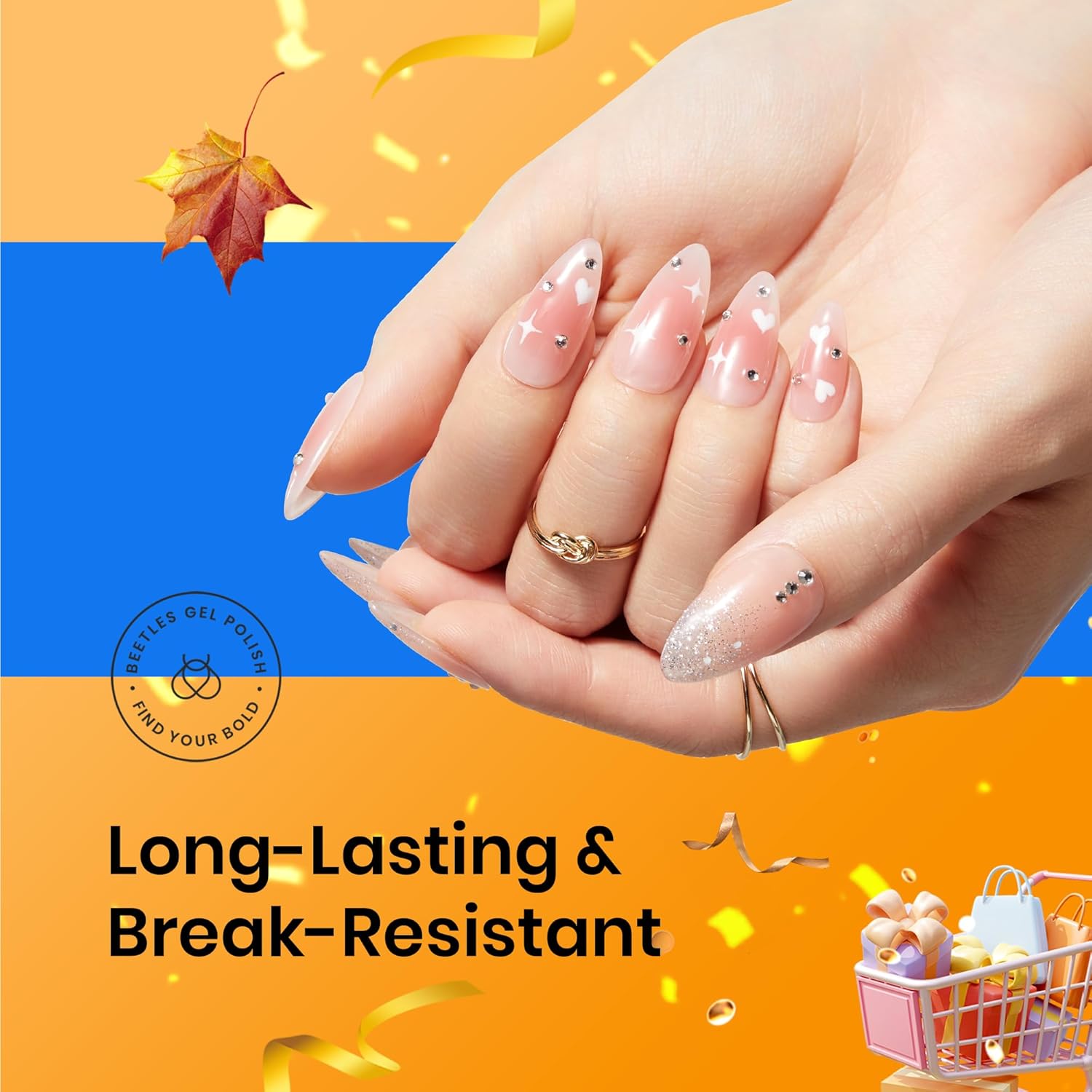 - 【5-In-1 Nail Glue Kit (2x15ml / 2x0.51fl.oz)】: Our new Nail Glue Gel Kit includes 2Pcs 15ml Nail Glues Gel allowing you to easily extend your nails and enjoy DIY fun! This multi-functional Nail Glue is versatile, serving not only as a nail tips binders but also as a Base Gel, Blooming Gel, Rhinestone Glue Gel, and Slip Solution. Experience the magic it offers! (Warm Tip: Beetles UV Nail Glue Gel Set is intended for clear nail tips, not for solid press-on nails.) Beetles Fall Nail Fest