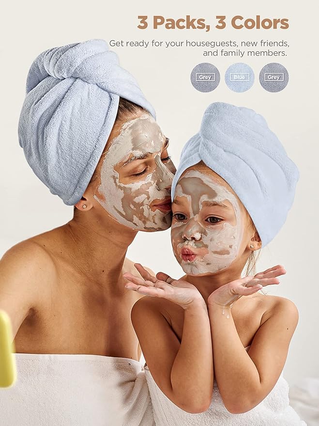 Hicober Microfiber Hair Towel, 3 Packs Hair Turbans for Wet Hair, Drying Hair Wrap Towels for Curly Hair Women Anti Frizz (Grey,Blue,Grey)