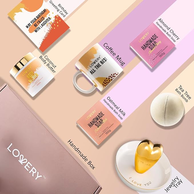 - SELF CARE GIFTS FOR WOMEN – This Stress Relief Gifts is Handmade and includes Coconut Body Butter, Oatmeal Milk Handmade Bath Soap, Almond Cherry Handmade Bath Soap, Tea Tree Bath Bomb, Mug saying “ALL THE BEST”, Jewelry Tray saying “I LOVE YOU”, & Personalized Greeting Card saying “MAY YOUR BIRTHDAY BE FILLED WITH LAUGHTER”, wrapped with confetti in a handmade box ready for gifting and last minute gifts.