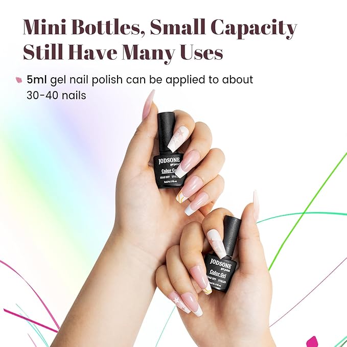 - What You Get: JODSONE 32 Colors Gel Polish (5ml each bottle) and 4 x No Wipe Base and Glossy & Matte๏ผGlitter Top Coat. 32 classic and fashionable colors, suitable for all seasons and daily life! Owning the JODSONE 32 colors gel nail polish kit will make you addicted to the fun of nail DIY.