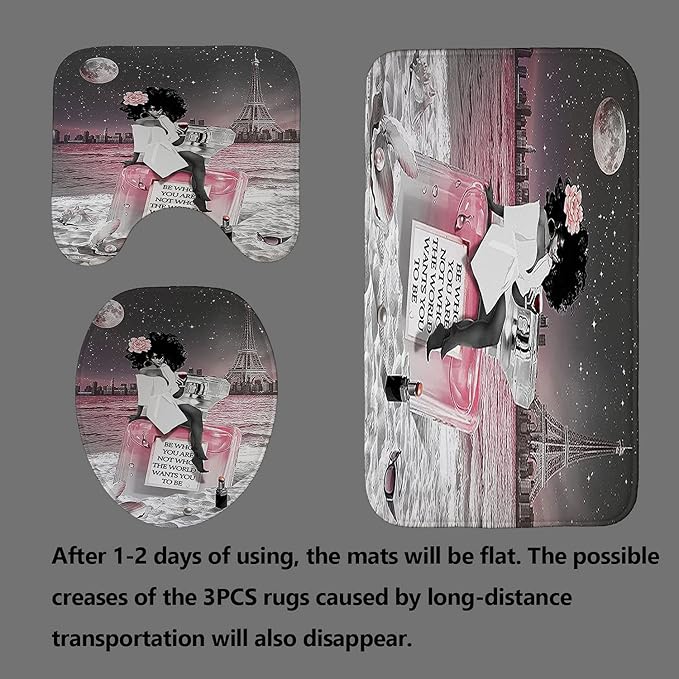 4PCS Sexy Black Girl Shower Curtain Set, Inspirational Quotes African American Woman Full Moon Starry Sky Eiffel Tower Beach Perfume Fashion Bathroom Decor, Non-Slip Bath Mat, Be Who You are