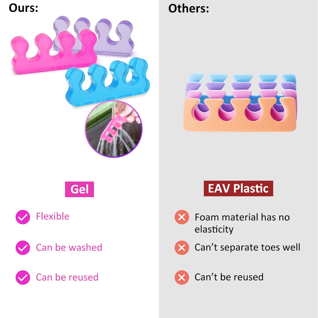 - đăReusable,easy to cleanăToe Separators for Pedicure can be cleaned repeatedly,and jelly material that can be used multiple times is not easy to deform.Upgraded version of Foam pedicure toe separator.Rinse once with water before use.ăWarrantyă:We love our customers,If you are troubled by product problems,please contact us as soon as possible to solve it for you,including return or exchange.