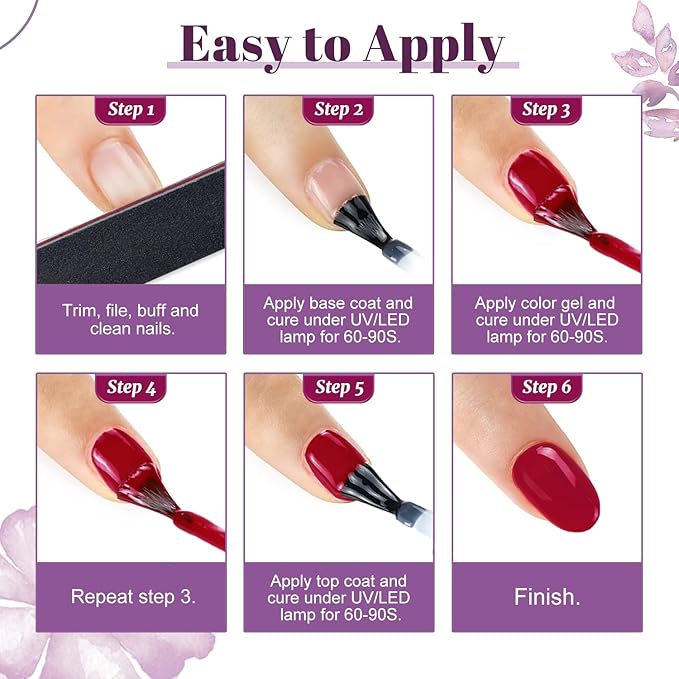 - Fast Curing and Long-Lasting: The gel nail polish set needs to be cured directly under a nail lamp after each coat is applied. Base coat and top coat gel nail polish are required. Gel nail polish can long last for 21 days when you follow the right steps.