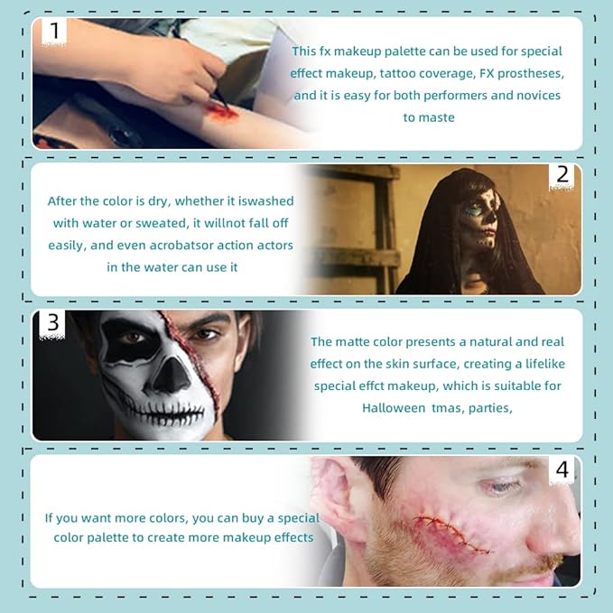 - 【Real Experience】Cost-effective makeup palette, and excellent waterproof performance and easy to remove, whether it is used for special effects makeup for acting or Halloween for zombies, monsters, vampires and other horror models. The capacity of a color palette is 4.23oz. There are 12 colors for daily use. If you want more colors, you can buy another color makeup palette to supplement.