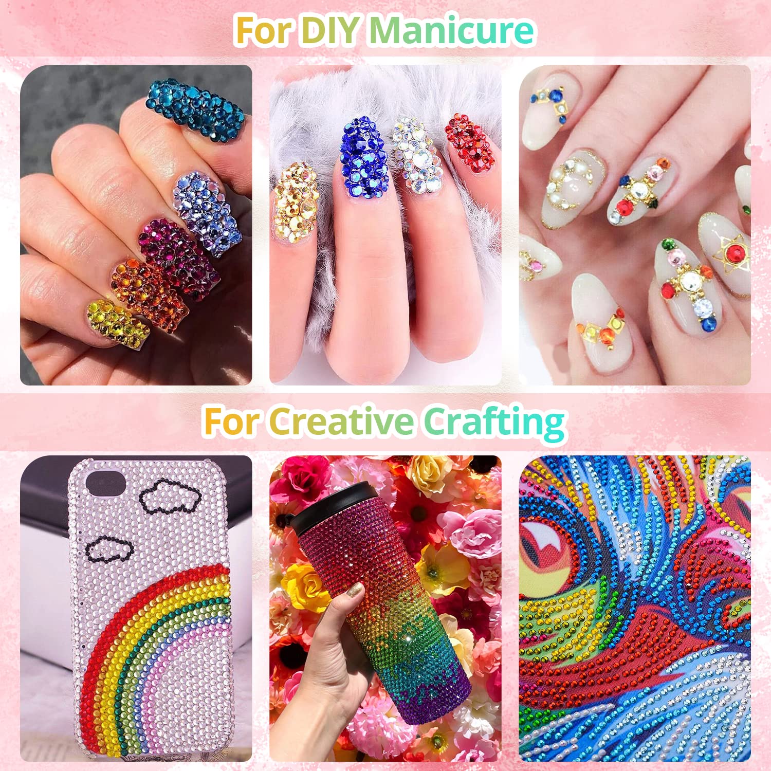 - đź’ŽWIDE APPLICATION -- The sparkling crystal iridescent gems nail rhinestones are perfect for creating glittering face makeup & body art, 3D nail art or bedazzing jewelry, DIY crafts, wedding dress or shoes, cell phone cases, glasses, greeting cards, bags, guitars, scrapbooks etc.