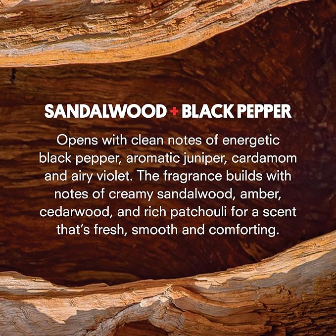 - SANDALWOOD + BLACK PEPPER: This warm and woody scent features Cardamom, violet, Elemi oil, and rose that create a rich yet light fragrance. Sandalwood, cedarwood, amber, and patchouli give it a fresh, smooth, and comforting character.