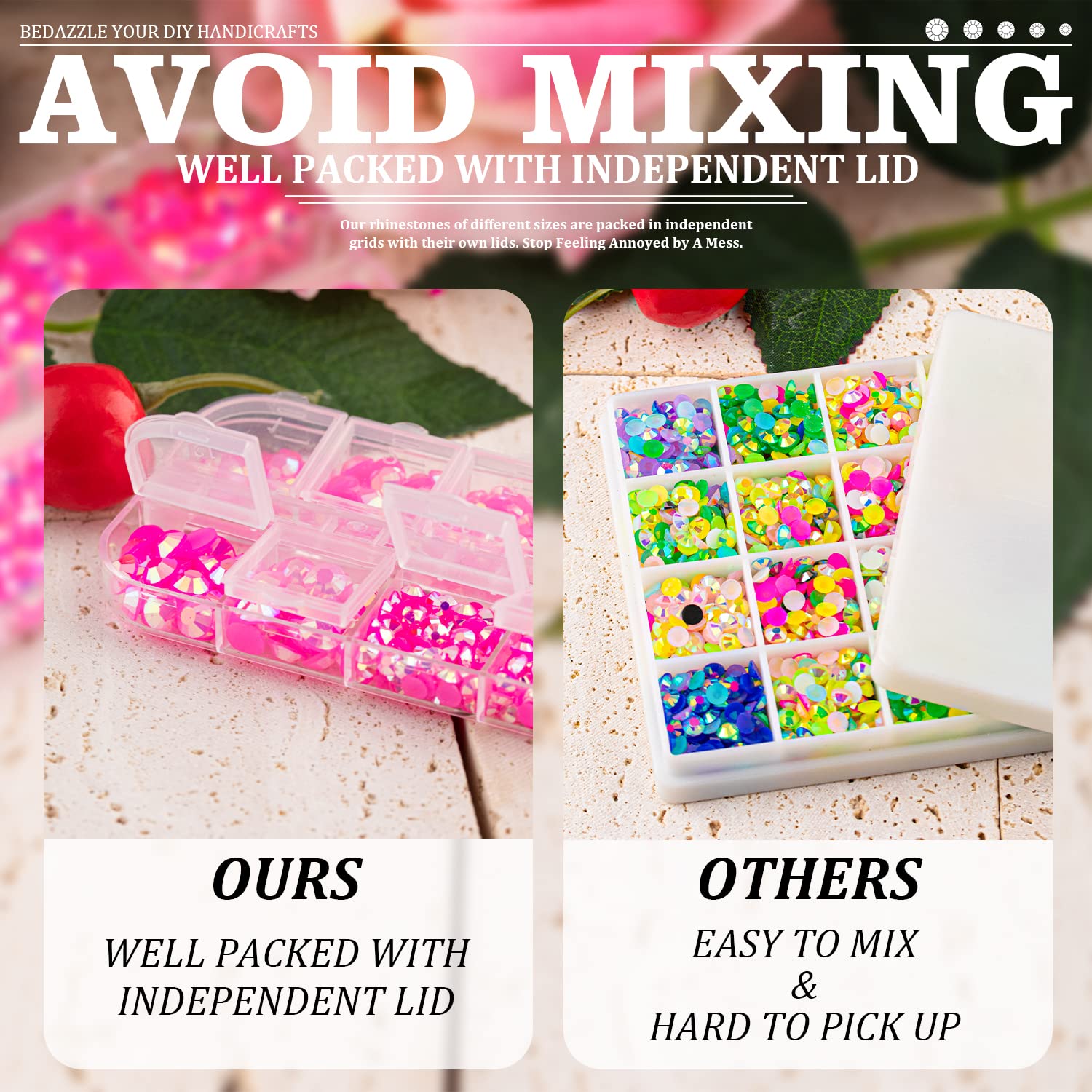 - đź’ŽPACKAGE CONTENT -- This resin rhinestone kit includes 4 boxes, each with 12 grids, featuring a variety of sizes: Box #1/#2 contains 2mm x 1 grid, 3mm x 1 grid, 4mm x 3 grids, 5mm x 3 grids, and 6mm x 4 grids; Box #3/#4 contains 3mm x 3 grids, 4mm x 3 grids, 5mm x 3 grids and 6mm x 3 grids. A tweezer and a pickup pencil are included for easy rhinestone picking. This set offers more large-sized gems, making it perfect for DIY craft decorations, eye makeup, face makeup and nail art.