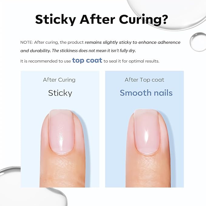 - Quick & Easy Application: High self-leveling formula along with built-in brush makes it easy to spread, help you create length, thickness or add strength to the nail you want, and ensure a smooth and natural nail foundation layer with impeccable shine. NOTE: It is normal for builder nail gel to remain a little sticky after curing, which will make a better adhesion between nails and gel layers. It is recommended to use top coat to seal it