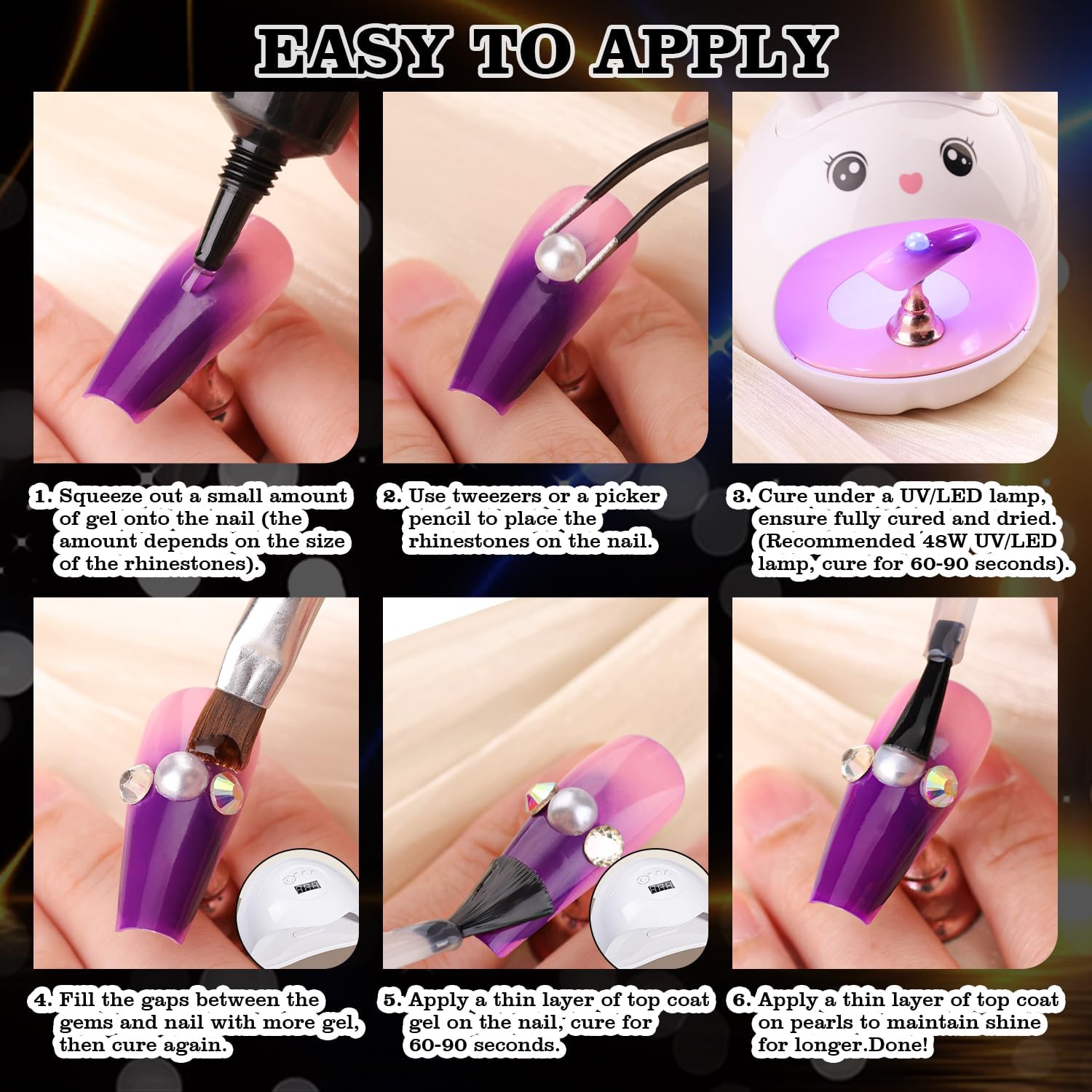- đź’ŽADHESIVE GEL GLUE -- The crystal clear nail gem glue uses a special, non-toxic and eco-friendly formula with strong tackiness, adhesion, and fluidity for easily applying decorations. It is a type of UV gel glue. After proper curing under a UV/LED lamp, the glue dries clear with superior bonding strength that can last weeks without falling off. With the designed tip, you can easily and conveniently apply the glue to the nail bed or the surface of false nails.