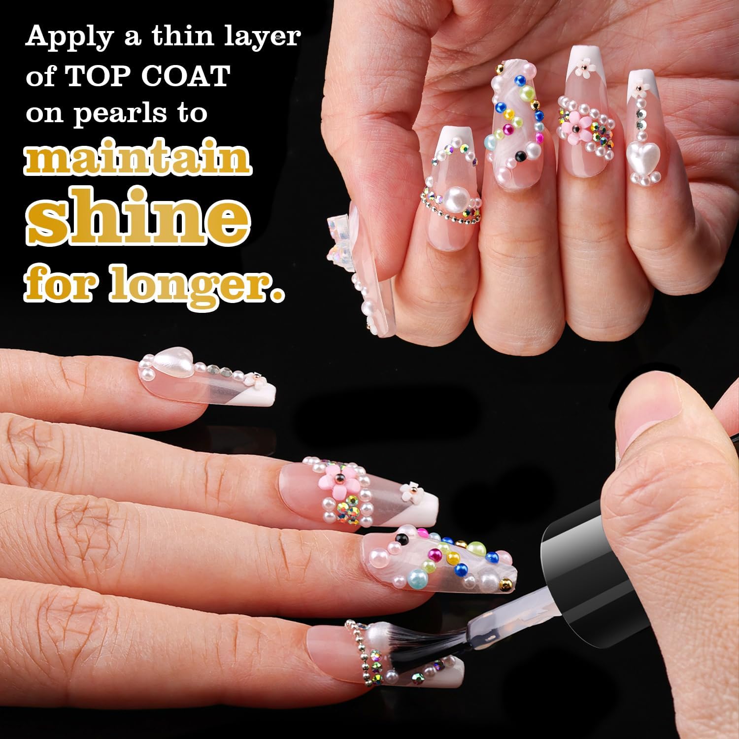 - đź’ŽCHARMING COLORS & DISTINCTIVE EXTERIOR -- The clear color diamonds are luxurious and versatile that can be applied to multiple scenes. The AB color nail jewels can reflect bright light with iridescent glamour. All the nail crystals are featured with exquisite shapes and cutting facets. Our half-round pearl beads in colors of white and beige are smooth and glossy. We suggest applying a top coat over the pearls after completing your nail art to better maintain the pearls' luster and color.