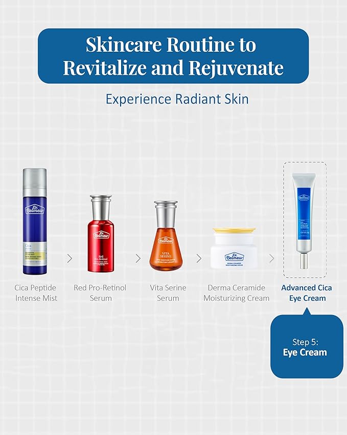 - DR. BELMEUR ADVANCED CICA EYE CREAM (25ml/0.9fl oz) is specially formulated for delicate under-eye skin, offers a soothing solution that minimizes irritation.