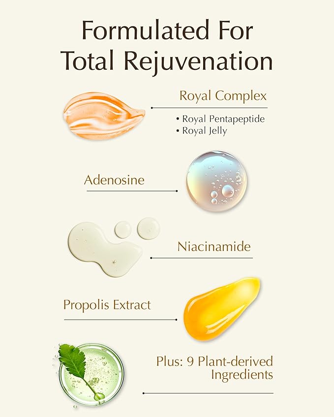 - ROYAL COMPLEX & NUTRIENT-RICH INGREDIENTS - Experience the power of Royal Complex, featuring Royal Pentapeptide and Royal Jelly Formula, for skin rejuvenating benefits. Adenosine, niacinamide, propolis extract, and 9 plant-derived ingredients provide comprehensive skincare, improving wrinkles, skin density, elasticity, and hydration.