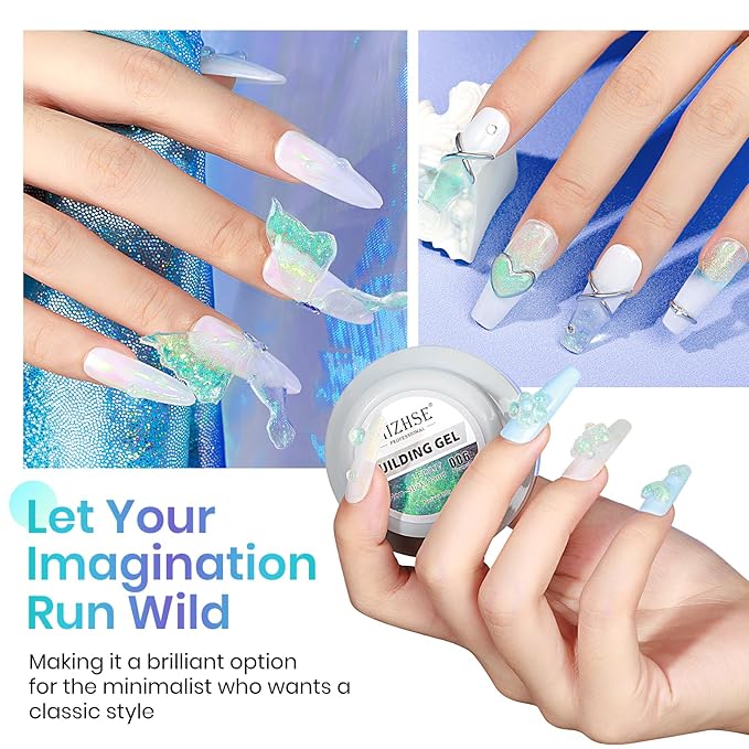 - Pearl Mermaid Solid Builder Gel: MIZHSE new upgraded solid builder gel for nails contains 1*30 g/1.05 oz hard gel for nails, 1*double head pen for 3D nails, and 24pcs nail forms. This nail builder gel is solid material, and won't leak everywhere, just use your finger to extend your nails. Easy application, friendly for nail beginners and nail lovers