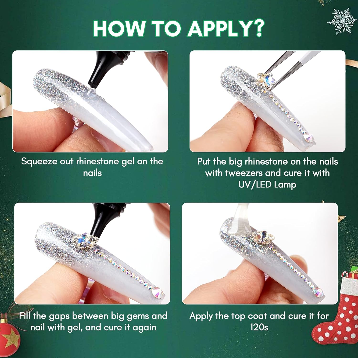 - Easy Application: Suitable for artificial nails, press-on nails, mobile decorations, and more. Start by applying the rhinestone glue on your nail, then use the tweezers to place your desired Christmas charm on the nail, filling gap between the nail and the charm. Cure with a UV or LED lamp, then apply a top coat for a more durable and long-lasting effect.(Note: The set does not include rhinestone glue gel)