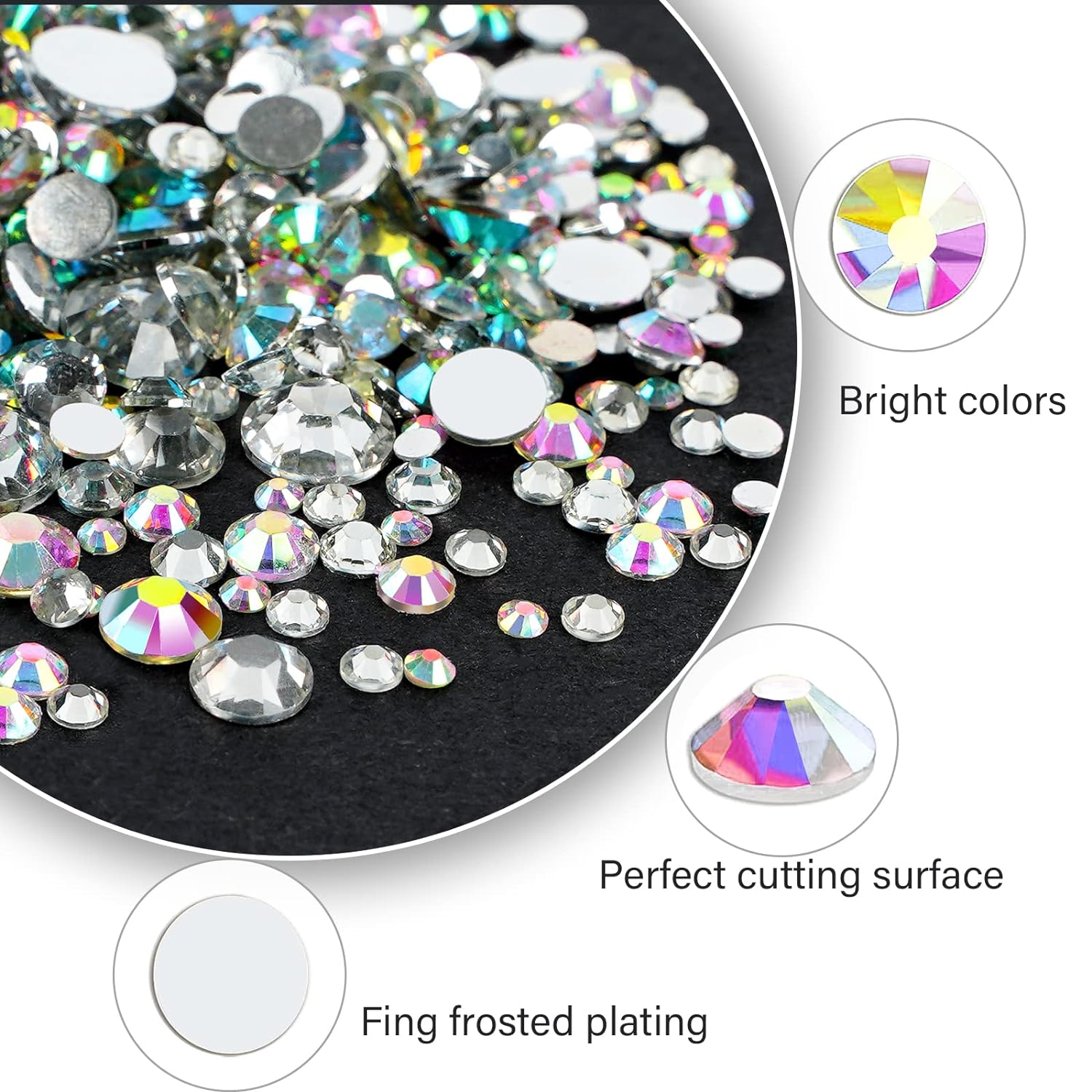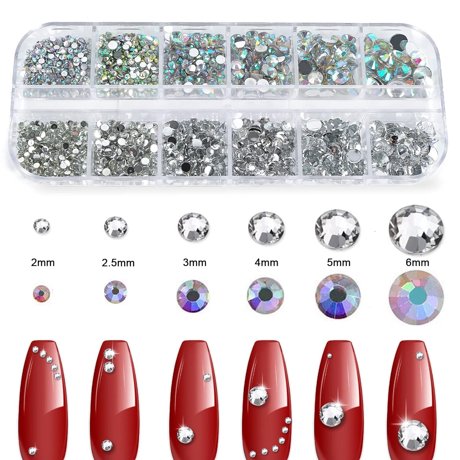 - PACKAGE - Each pack contains 6 grid of rhinestones of AB color and 6 grid of rhinestones of clear color; and includes 1 double point dotting pen and 1 tweezer, perfect for creating various styles of nail art. The beautiful nail rhinestones set also the perfect stocking stuffers in Christmas gifts for women.