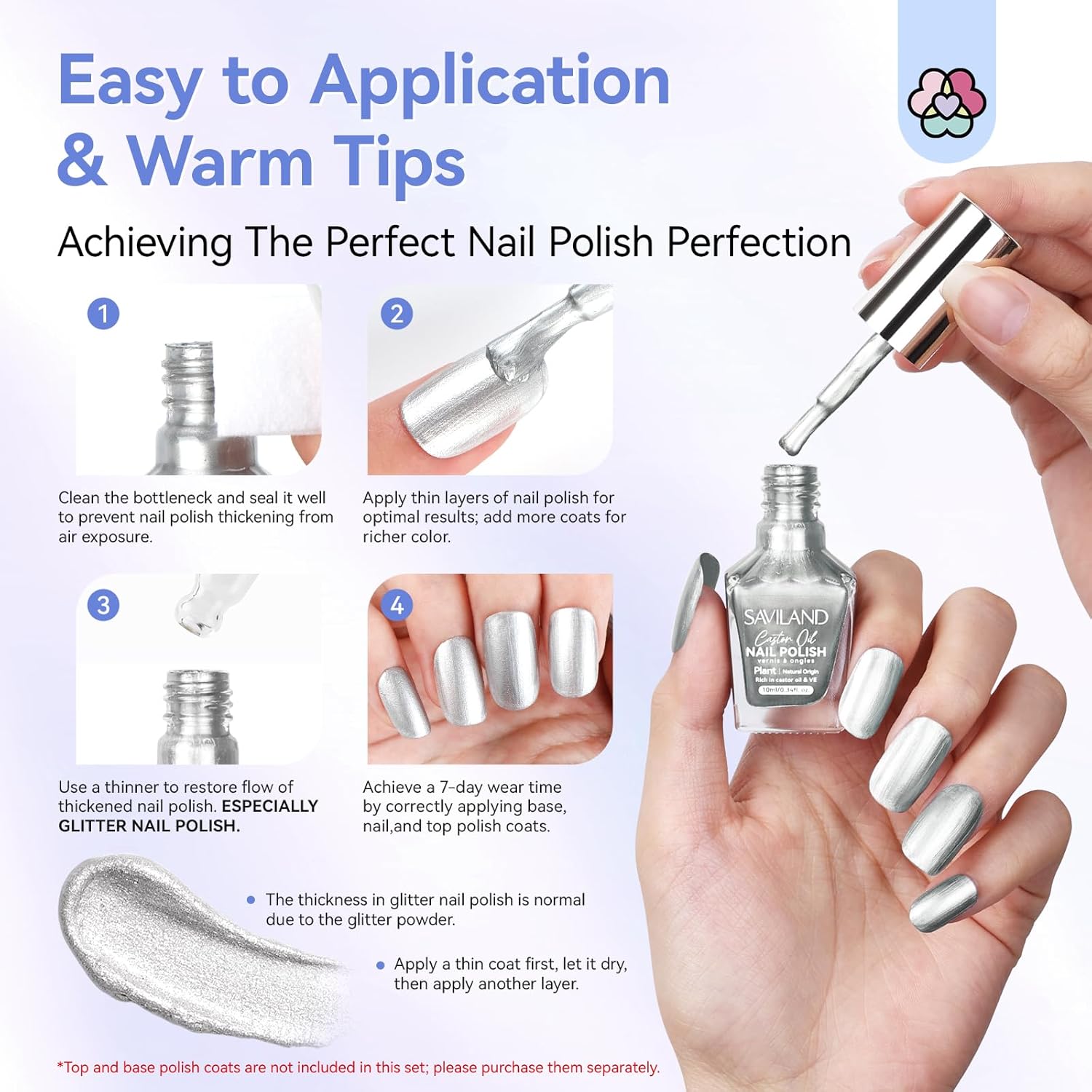 - Easy to Apply & Remove: SAVILAND fingernail polish offers a simple application process, suitable for beginners, with one stroke for a smooth, even coat. Removal is just as easy: soak a cotton pad in nail polish remover, press it onto the nail for 5-10 seconds, and wipe clean