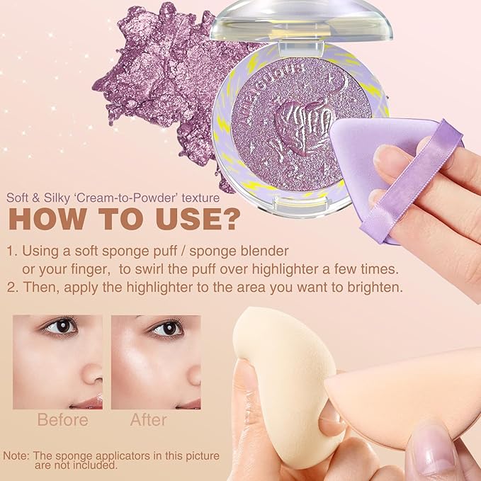 - 【Silky-Soft Texture for Effortless Application】Indulge in the luxury of our Radiant Illuminator for Face, boasting a smooth and velvety 'Cream to powder' texture that effortlessly glides on, blending seamlessly with your skin. This product is an ideal choice for both beginners and seasoned makeup enthusiasts. here comes with easy-to-follow application instructions: Simply use a soft sponge puff, sponge blender, or your finger to swirl over the highlighter a few times, and then apply the sparkling illuminator to the desired area for a brightening effect.