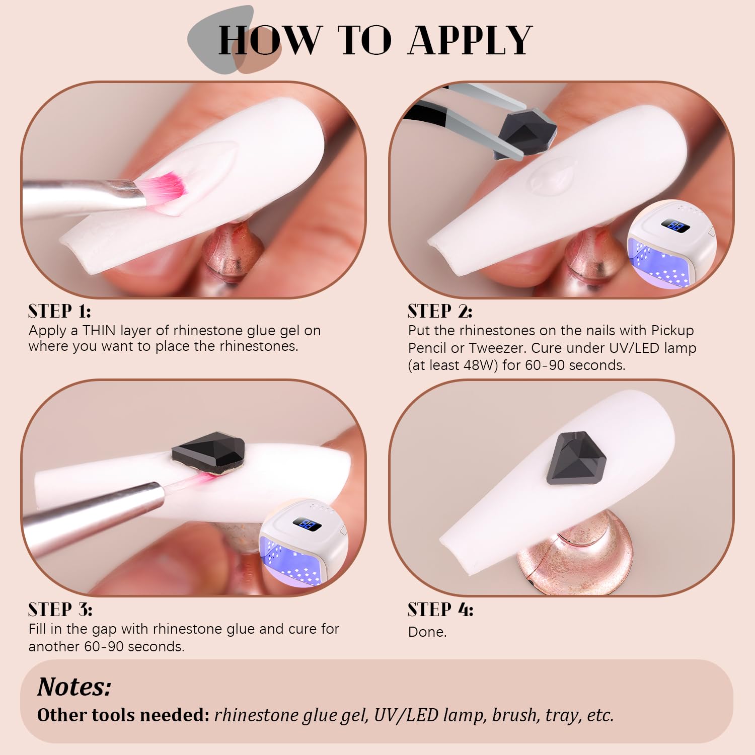 - đź’ŽEASY TO USE -- Easy to apply on artificial nails. After applying nail polish and applying enough gel on the nails, simply use the equipped tools (pickup pen + tweezers) to pick up the crystals onto your nails to create your fabulous DIY designs! These crystals gemstones are different from those hotfix stones, they are not self-adhesive, you have to apply glue to stick them (glue is not included.)