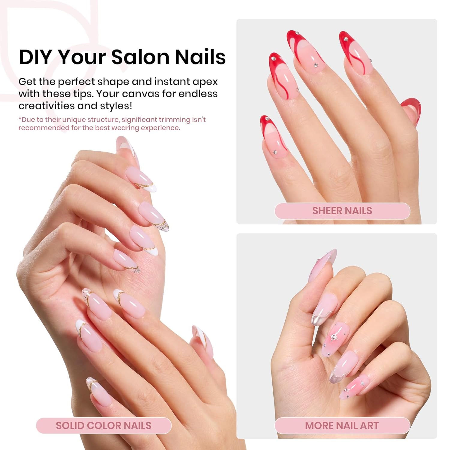 - One-Step Nail Building, Long-Lasting Results:Includes 192 tips in 16 sizes to fit over 95% of clients. Apply with solid glue gel—no acrylic, dip, or builder gel needed. These durable tips give you smooth, bubble-free nails that last 3 weeks without yellowing or lifting.