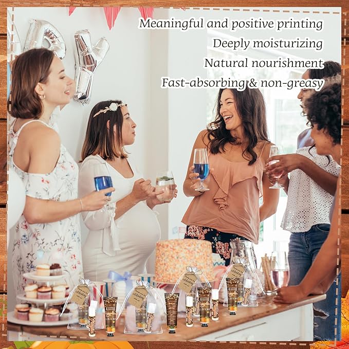 - Pumpkin Baby Shower Guest Gifts: whether for a baby shower party, birthday, wedding, anniversary or simply as a treat for yourself, the package includes 50 each of pumpkin theme hand lotions, lip balms, organza bags, kraft paper tags with hemp ropes that add a splash of elegance to your gift setting
