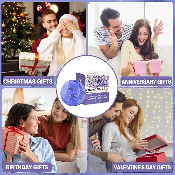 - LAVENDER SHAMPOO BAR: This shampoo bar contains rich lavender oil, lemon oil other plant essences to soothe the scalp, regulate the secretion of scalp oil, keep the scalp pores clean, help remove dandruff, and make the hair fresh, fluffy, healthy and shiny. It is suitable for neutral and oily hair!
