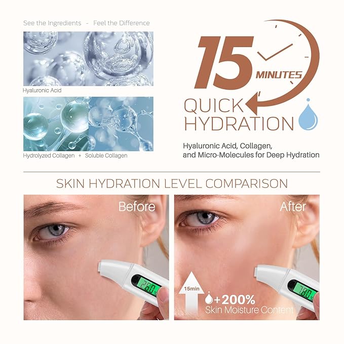 - Deep Hydration & Barrier Support: Hyaluronic Acid locks moisture, boosting skin’s hydration. Dual Collagen Complex (Hydrolyzed & Soluble) repairs micro-damage, strengthens the moisture barrier, and restores elasticity for firmer, plumper skin