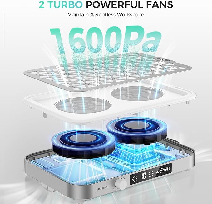 - POWERFUL SUCTION:The nail dust collector have 2 x 6500RPM turbo fan with brushless motor generating 1600PA of suction. It can adsorb and collect the nail dust from 360 degrees efficiently with 99.99% vacuum effect. A must-have for nail salon, allow customers to enjoy a better quality of service