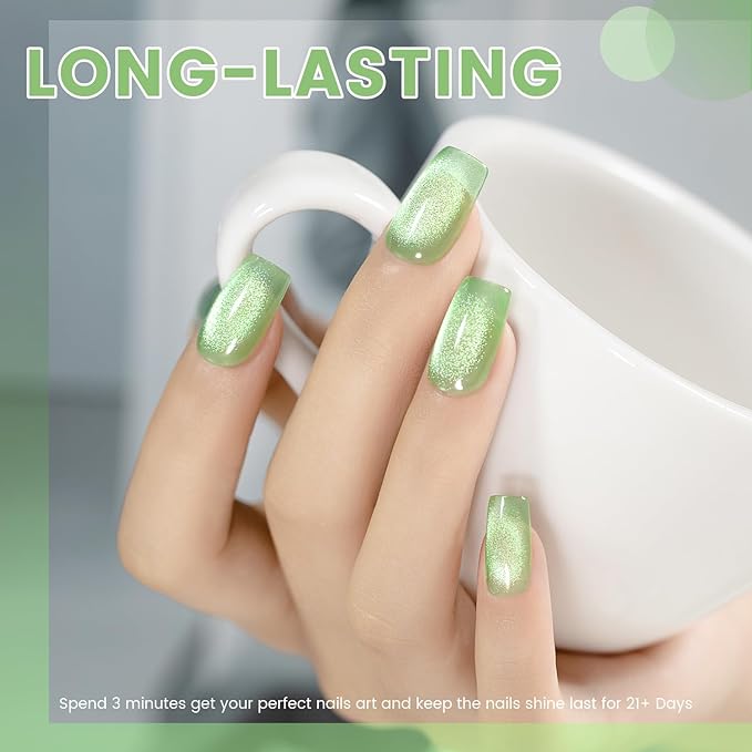 - GREEN CAT EYE EFFECT:Each gel polish in this cat eye gel nail polish set contains reflective sparkly diamond ceramic glitter, adding a dazzling touch that shines brilliantly under light, making your nails stand out effortlessly