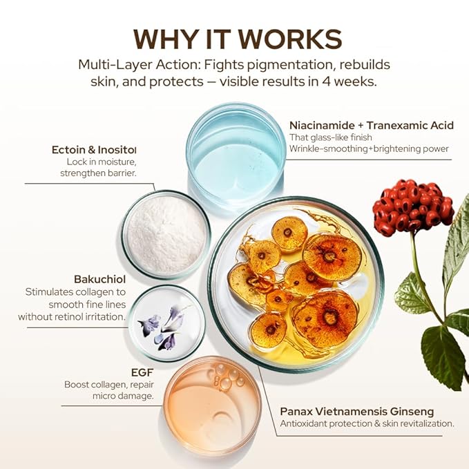 - Infused with 6-Year-Old Vietnamese Ginseng – Rich in rare Ginsenosides (precious ginseng saponins), this powerful botanical rejuvenates skin at the cellular level, enhancing vitality, boosting elasticity, and promoting timeless beauty from within.