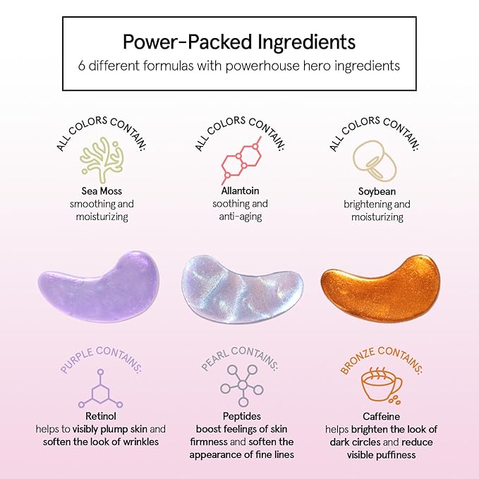 - The Ultimate Eye Mask Pack - Love our undereye mask patches? Experience all 6 colors with our 18-pair variety pack. You get 3 pairs each of our gold, pink, blue, purple, bronze, and pearl under eye masks for you and your besties to refresh & relax.