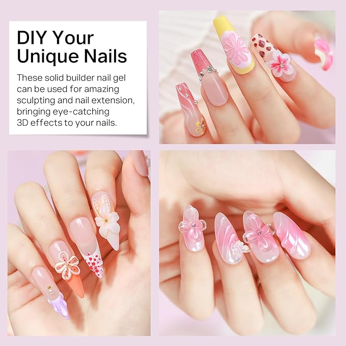 - Versatile Solid Builder Gel: Ideal for for carving, chrome powder application, and intricate nail decorations, this non-sticky formula allows you to create flowers, bows, and other 3D shapes