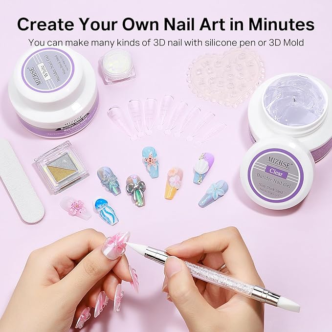 - Solid Builder Gel Kit: This kit contains 2*60 g/2.1 oz solid builder gel for nails, 1*3D mold, 1*double-head pen for 3D nails,silver gold chrome powder and 36 pcs nail forms. Effortlessly sculpt and extend your nails using your fingers or the included tool, making it good for both beginners and pro