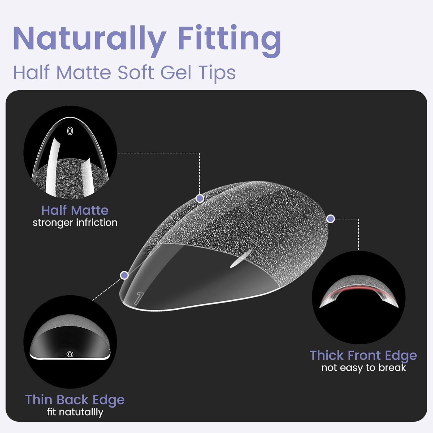- 0 Pressure Breathable Feeling - Wilfniee Medium almond shaped nail tips designd with “ Thin back edge, thick front edge”for natural fit effect. The thinner back edge can make the soft nail tips fit your nails better, which will not make you feel uncomfortable. Also, the clear nail tips are more breathable, which will not cause burden and pressure on your fingers; The thickened front edge makes it not easy to break or bend for last long time use. Just like grows on you, prefect fitting