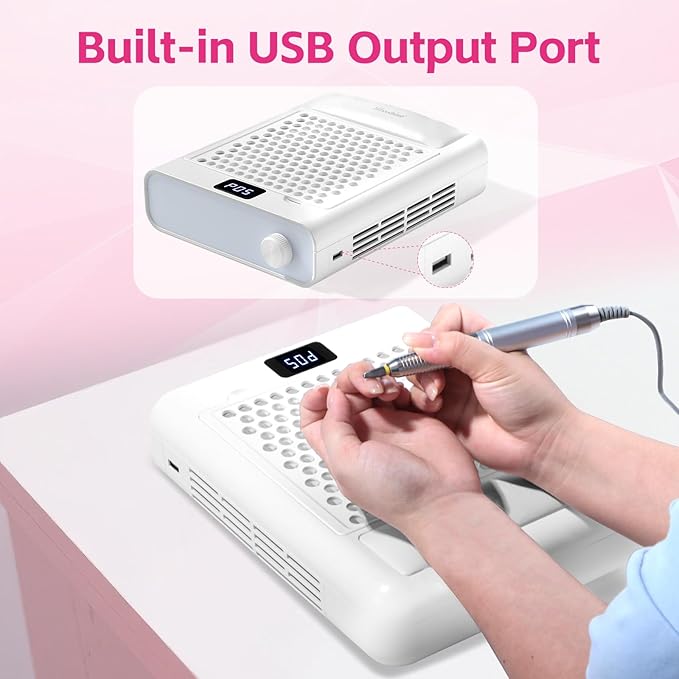 - Flexible Design with Adjustable Stand & USB output port:This nail dust vacuum machine adapts to your work style with a dual-position adjustable stand—use it flat for stability or raised for optimal angle. Plus, the built-in USB output port keeps your nail drill or phone charged and ready, adding smart convenience to your beauty space