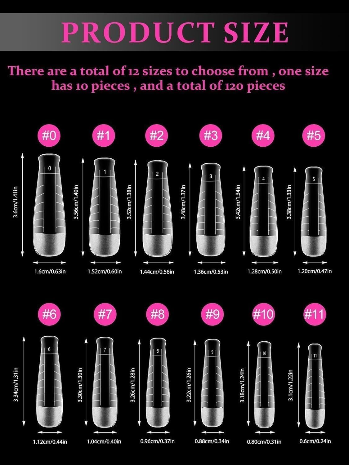 - Package Content: This 120 pieces professional clear dual nail forms set includes 12 sizes to fit most fingers, with 10 forms per size neatly organized in 12 compartment boxes. The pre-numbered labels on each nail mold let you quickly pick the right size without hassle, making sizing simple and efficient.