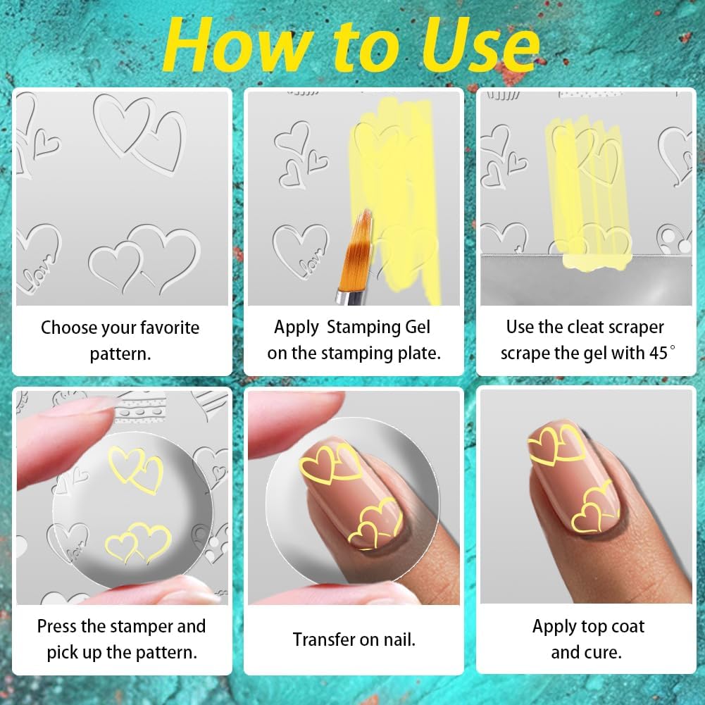 - Easy to Use: 1. Apply nail polish adhesive to the stencil, use the scraper to scrape off the excess 2.Use silicone stamper to press down on the transfer pattern 3. Quickly transfer the pattern onto your nails 4.Bake dry to apply sealer then shine the lamp